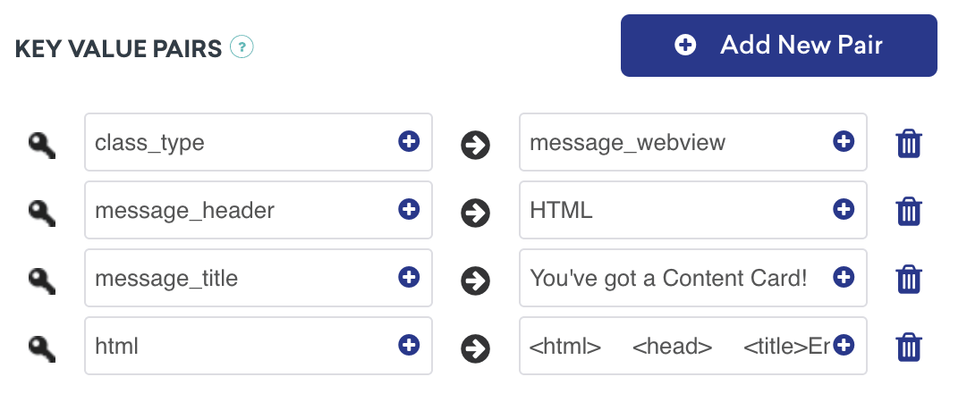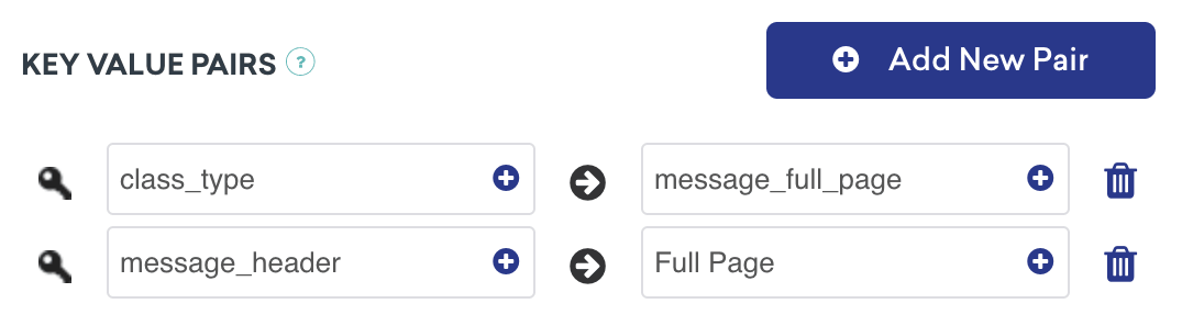 次のメッセージタイプでは、キーと値のペア class_type をダッシュボード設定に追加する必要があります。ここで割り当てる値は任意ですが、クラス型を区別できるようにする必要があります。これらのキーと値のペアは、ユーザーが簡略化された受信トレイメッセージをクリック際に行き先を決定するときにアプリケーションが参照するキー識別子です。