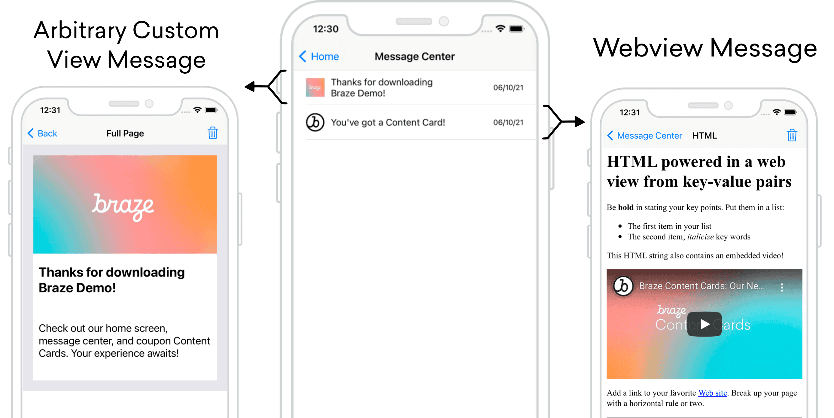 コンテンツカードは、各メッセージが独自のカードであるメッセージセンター形式で使用できます。メッセージセンター内の各メッセージは、コンテンツカードペイロードを介して入力され、各カードには、クリック時 UI/UX を起動する追加のキーと値のペアが含まれています。次の例では、1つのメッセージによって任意のカスタムビューが表示され、別のメッセージによってカスタム HTML を表示する Web ビューが開きます。