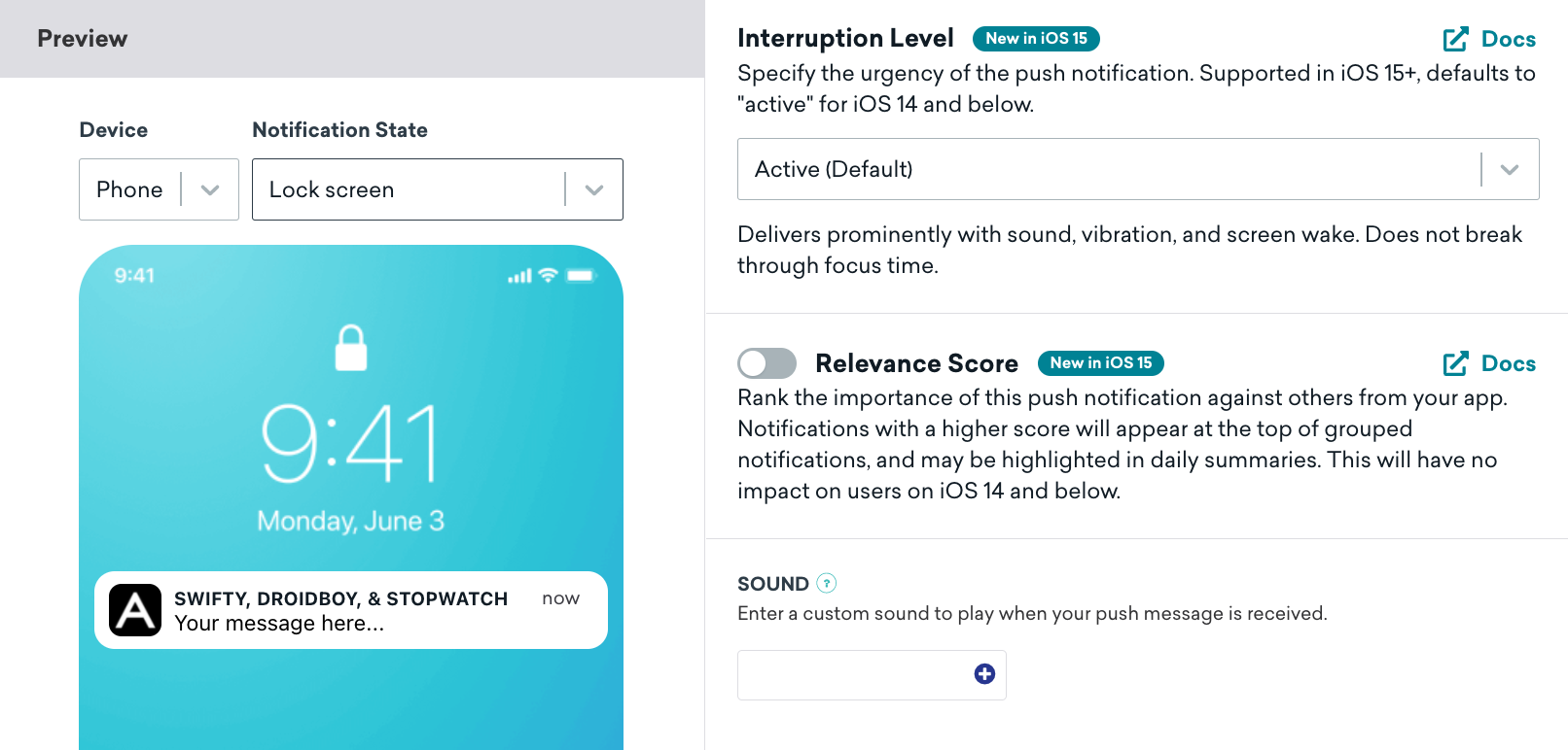 サウンドはアプリ内でローカルにホストする必要があります。プッシュコンポーザーの [サウンド] フィールドで、アプリ内のサウンドファイルにリダイレクトするプロトコル URL を指定する必要があります。このフィールドに「default」を指定すると、デフォルトの通知音がデバイスで再生されます。これは、以下のスクリーンショットに示すように、プッシュコンポーザーの [messaging API] または [設定] にあるダッシュボードを使用して指定できます。