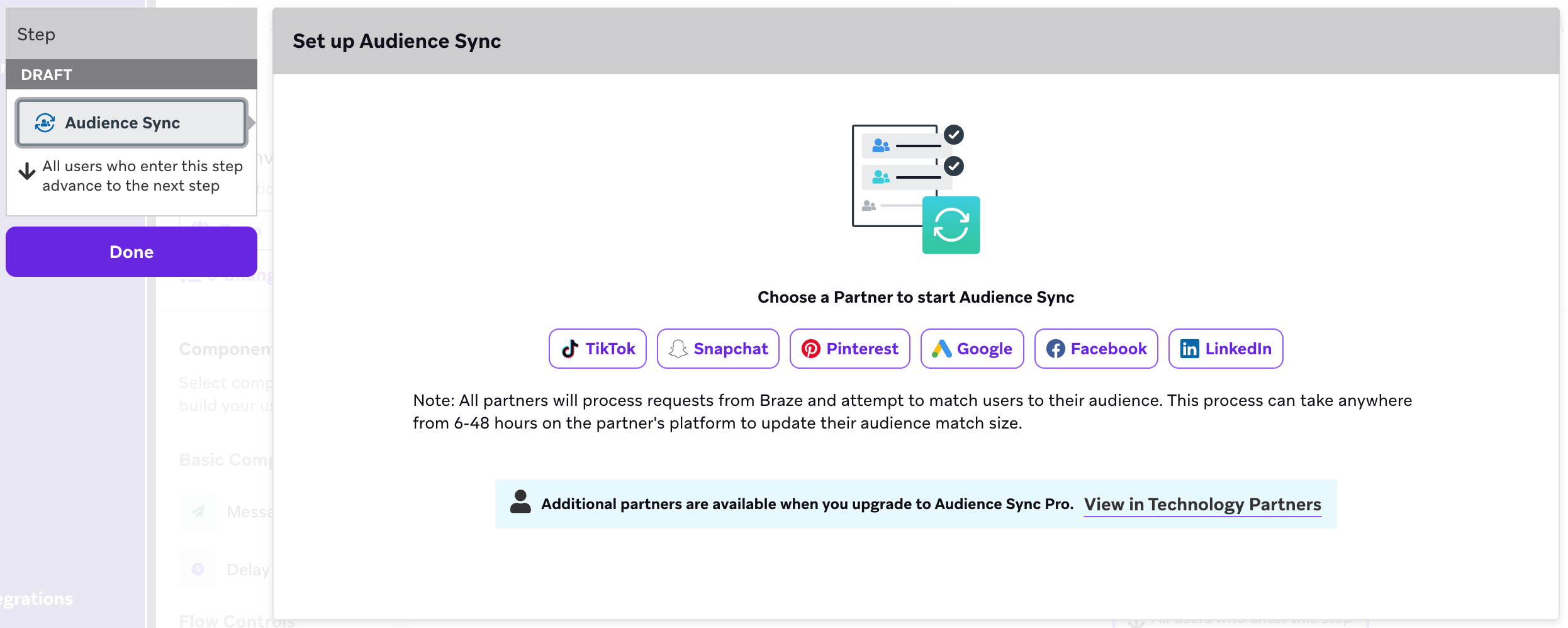 新しいオーディエンスを使用してキャンバスを起動すると、ユーザーがオーディエンス同期ステップに入る時点で、Braze はユーザーをほぼリアルタイムで同期します。