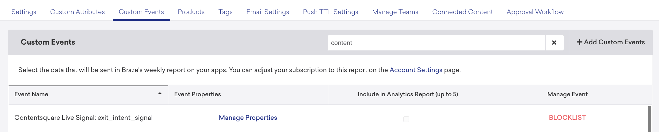 統合が完了すると、Contentsquareのカスタムイベントがキャンペーンやキャンバスで使用できるようになる。[Data Settings] > [Custom Events] から、どのイベントが Braze に送信されているかを確認できます。