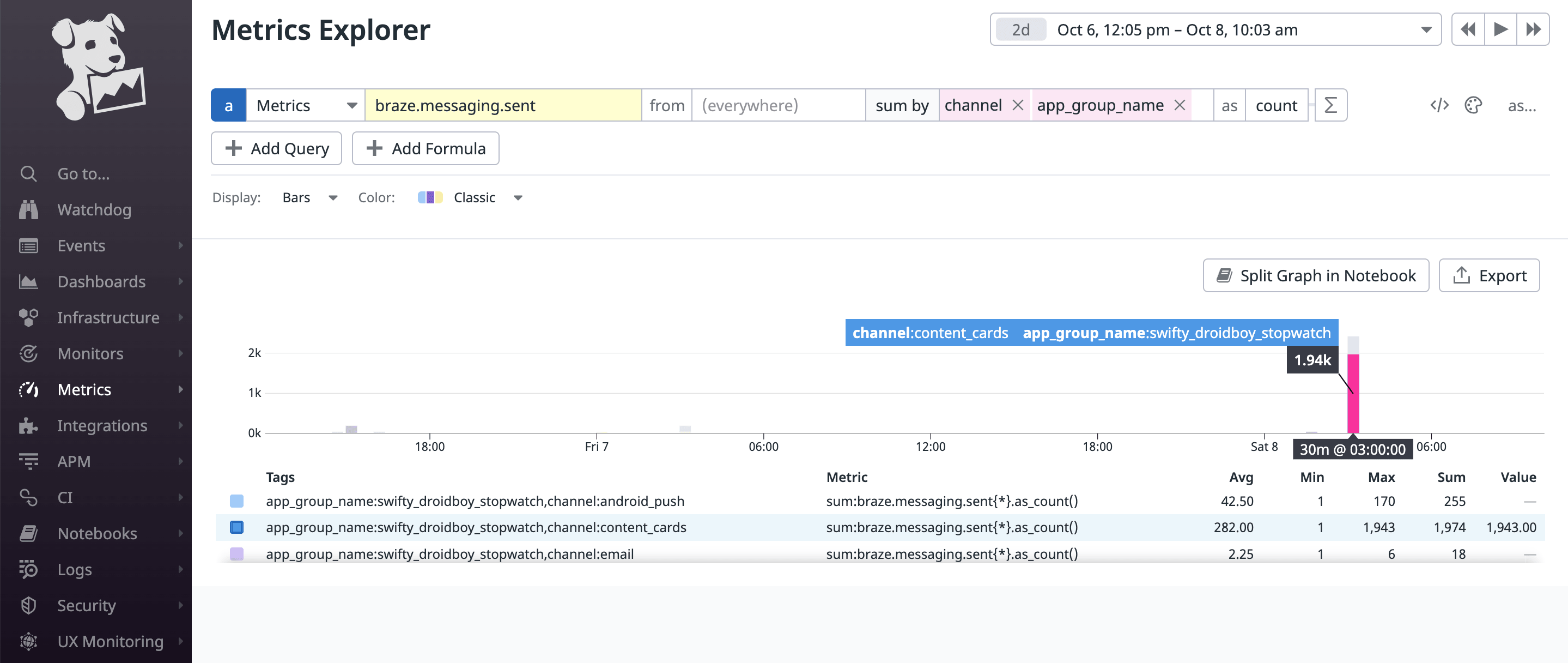 これらのイベントとタグは、DatadogMetrics Explorerページで監視できる。これらのメトリクスは、DataDogにディストリビューションとして記録される。指標の性質と、DataDog の集約とロールアップの不正確さを考慮して、Braze では、送信中に発生する可能性のある断続的なネットワークエラーやその他の DataDog API エラーの場合は再試行されません。つまり、これら指標の数値が、Braze ダッシュボードや Currents で表示される数値とは若干異なる可能性があります。