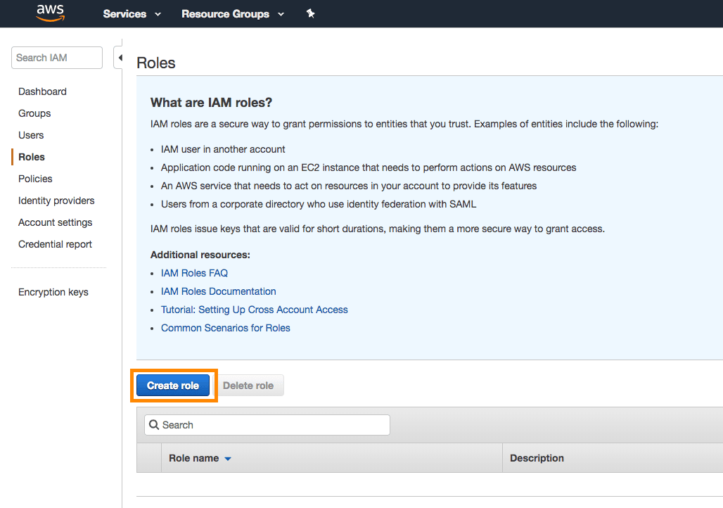 コンソールと同じ IAM セクションで、[Roles] > [Create Role] を選択します。