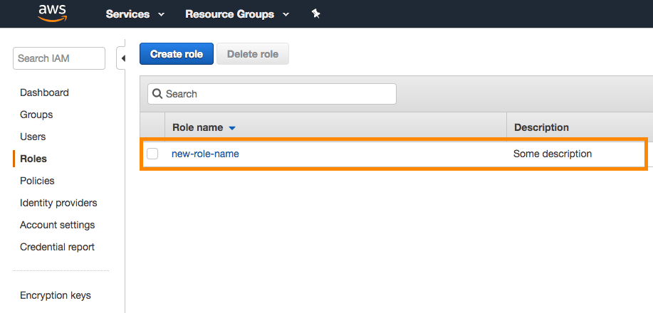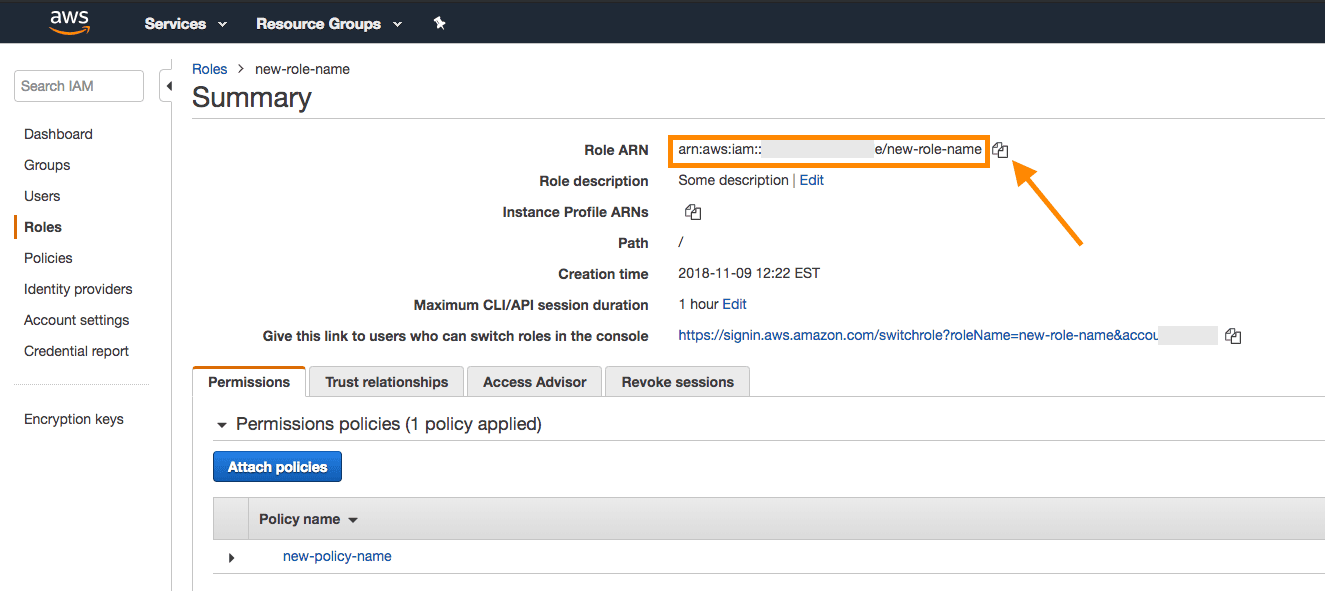 AWS コンソールで、新しく作成したロールを一覧で見つけます。名前を選択して、そのロールの詳細を開きます。