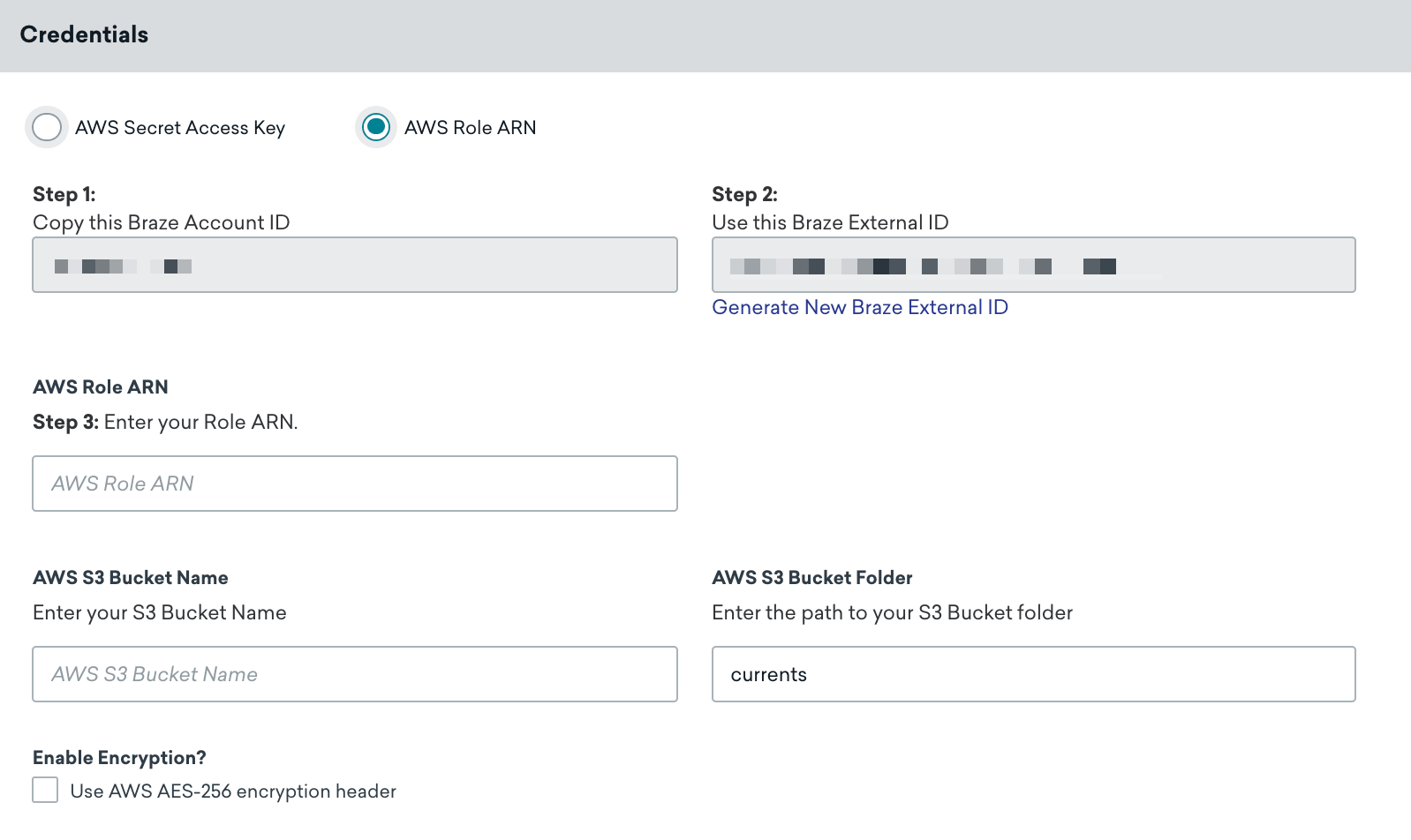 currentsです。このフォルダーが存在しない場合、Braze によって自動的に作成されます。 - サーバ側の保管時のAES-256 暗号化:デフォルトはオフで、