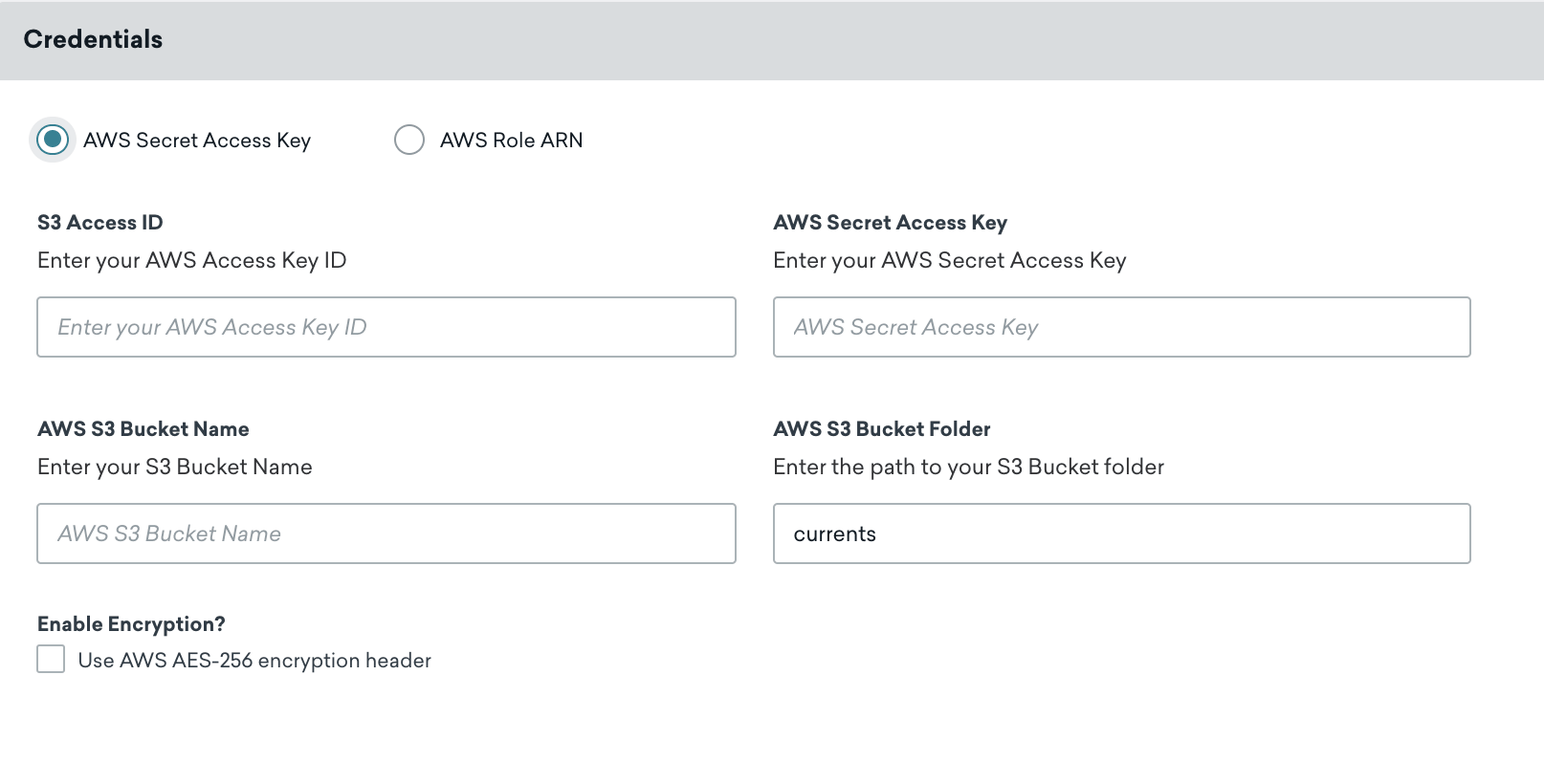 Current に名前を付けます。Credentials セクションで、AWS Secret Access Key が選択されていることを確認し、指定されたフィールドに S3 アクセス ID、AWS シークレットアクセスキー、および AWS S3 バケット名を入力します。