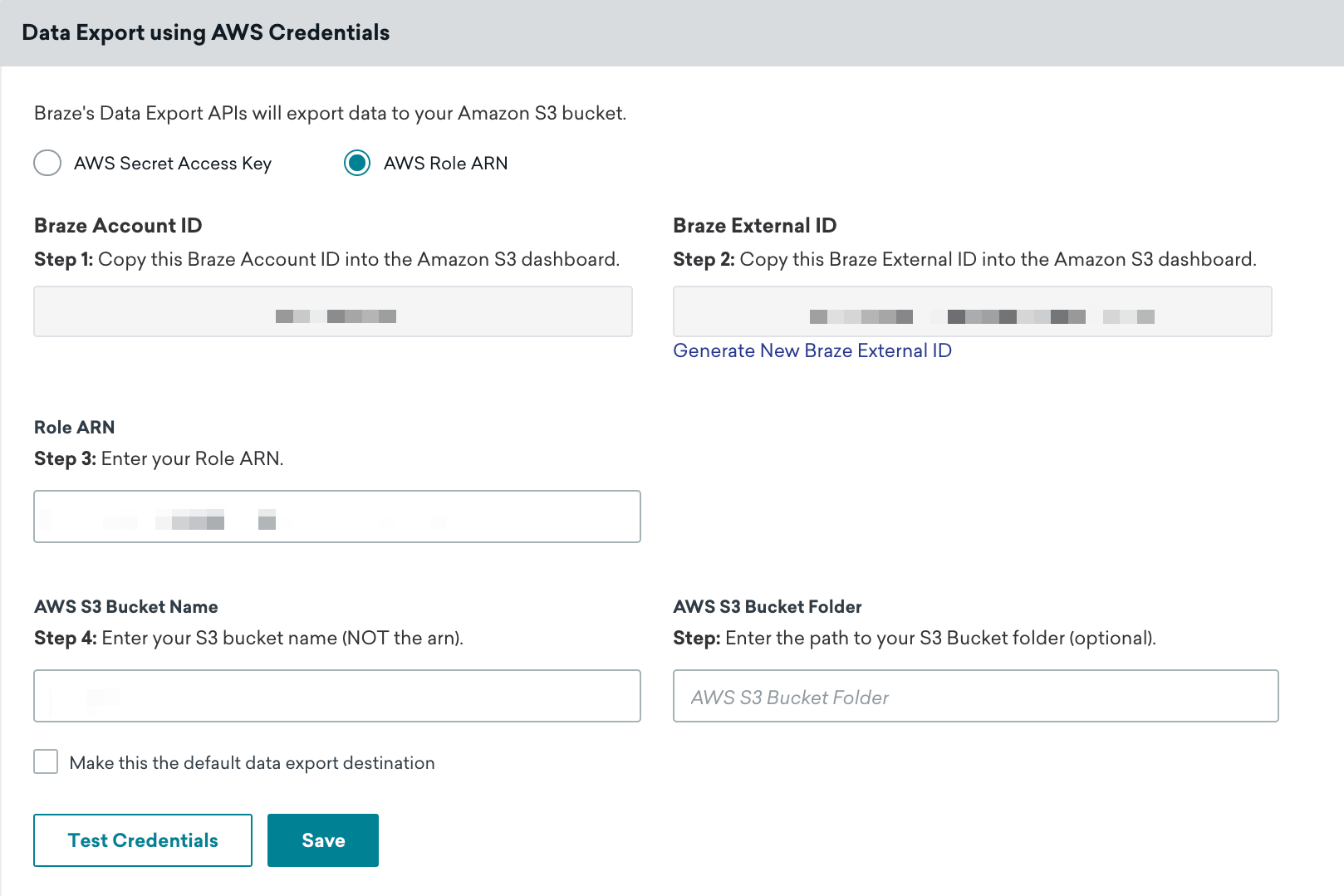 Braze アカウントに戻り、提供されたフィールドにロールARN をコピーします。