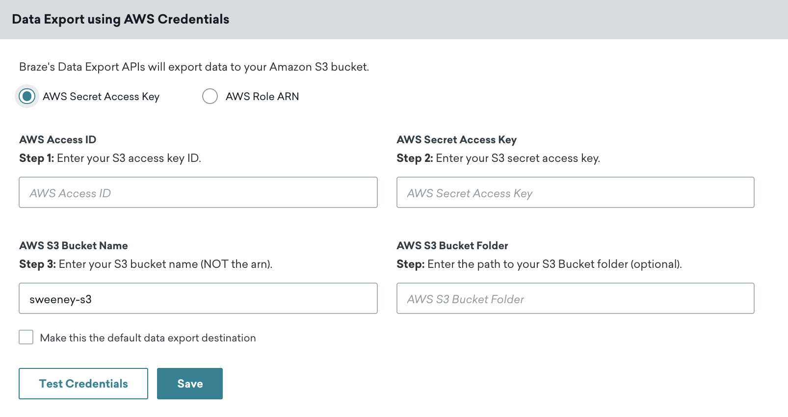 AWS Credentials ページで、AWS Secret Access Key が選択されていることを確認し、指定したフィールドに AWS アクセス ID、AWS シークレットアクセスキー、および AWS S3 バケット名を入力します。シークレットキーを入力する際は、まず [認証情報のテスト] を選択して認証情報が機能することを確認し、成功したら [保存] を選択します。