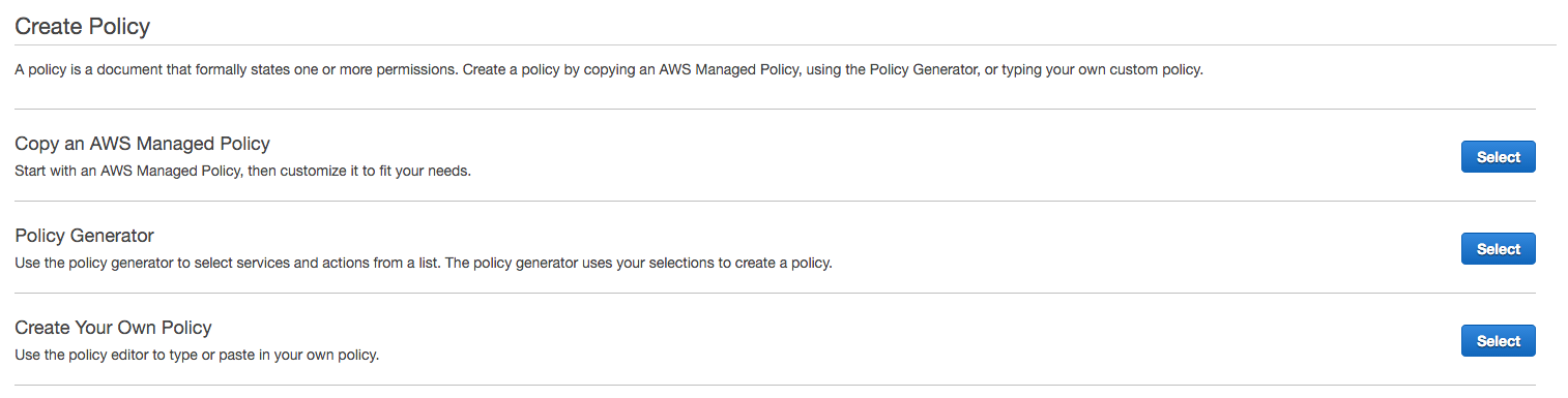 まず、アカウント管理者として AWS 管理コンソールにサインインします。AWS コンソールの IAM セクションに移動し、ナビゲーションバーで [Policies] を選択してから、[Create Policy] を選択します。