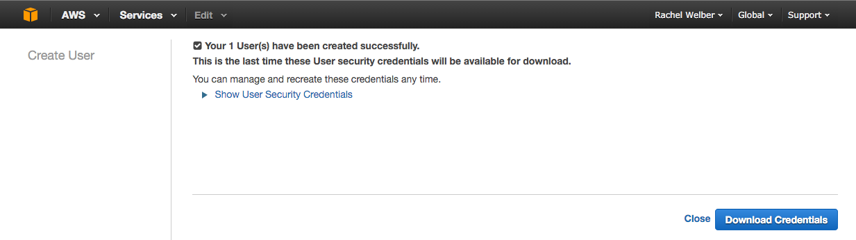 新しいユーザーの作成後に、Show User Security Credentials を選択して、アクセスキー ID とシークレットアクセスキーを表示します。これらの認証情報は後で Braze ダッシュボードに入力する必要があるため、どこかにメモしておくか、[認証情報をダウンロード] ボタンを選択します。