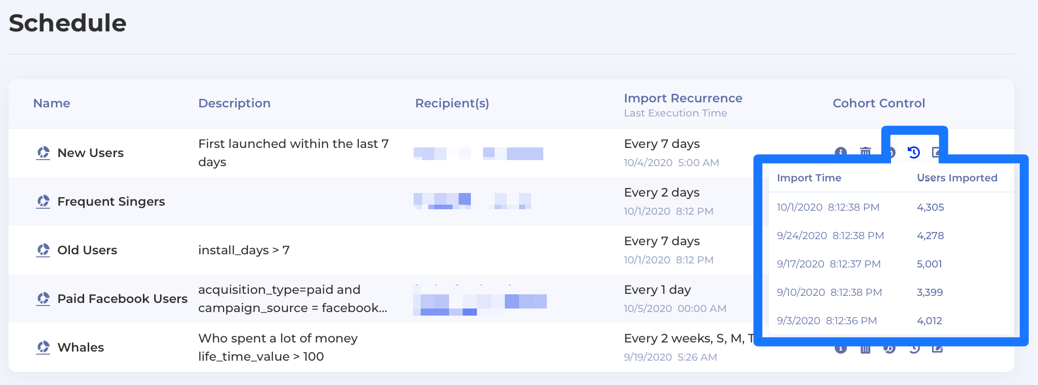 インポートが完了すると、インポートスケジュールで指定された受信者にEメール通知が送信される。また、Kubit の [Schedule] でコホートのインp-トステータスを確認することもできます。スケジュール履歴には、すべてのインポート実行時間、結果、Brazeにインポートされたコホート内のユーザー総数が表示される。
