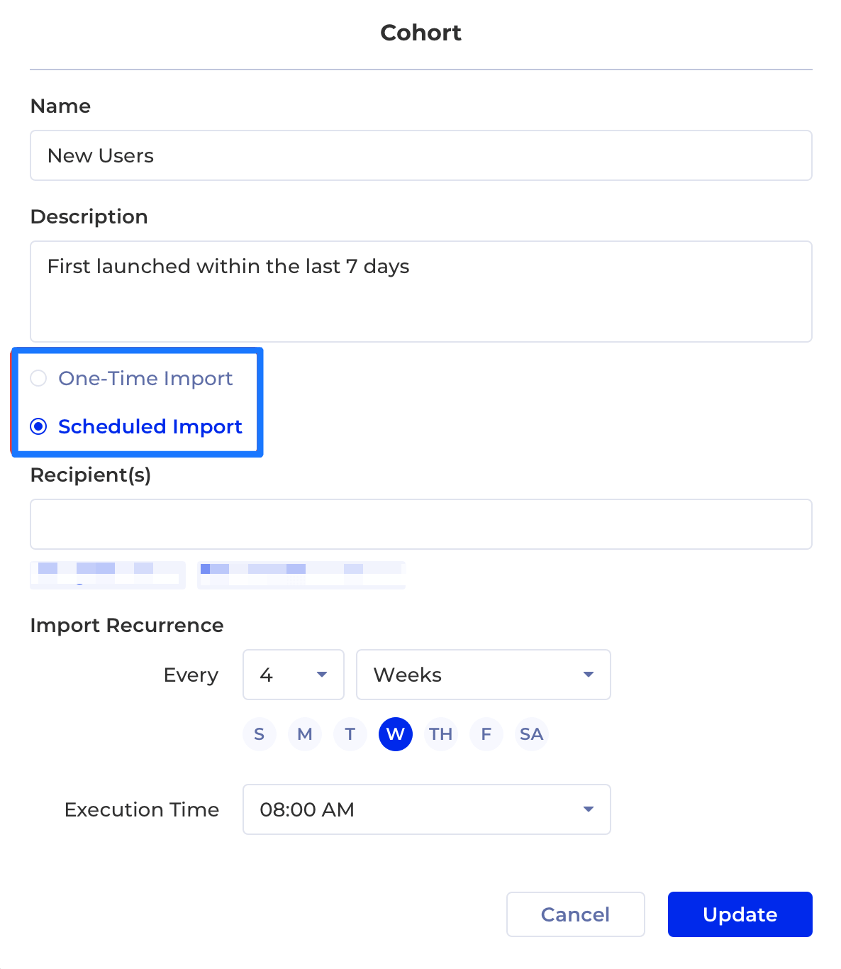 次に、使用するインポートケイデンスを選択します。[One-Time Import] では、今すぐ1回インポートできます。[Scheduled Import] では、毎日、毎週、または毎月の特定の時点にインポートできます。各コホートに設定できるライブインポートスケジュールは1つだけであることに注意してください。