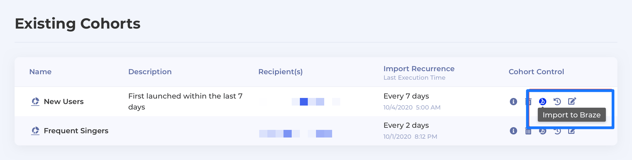 これを行うには、既存のコホートに移動し、[Cohort Control] で [Import to Braze] を選択します。