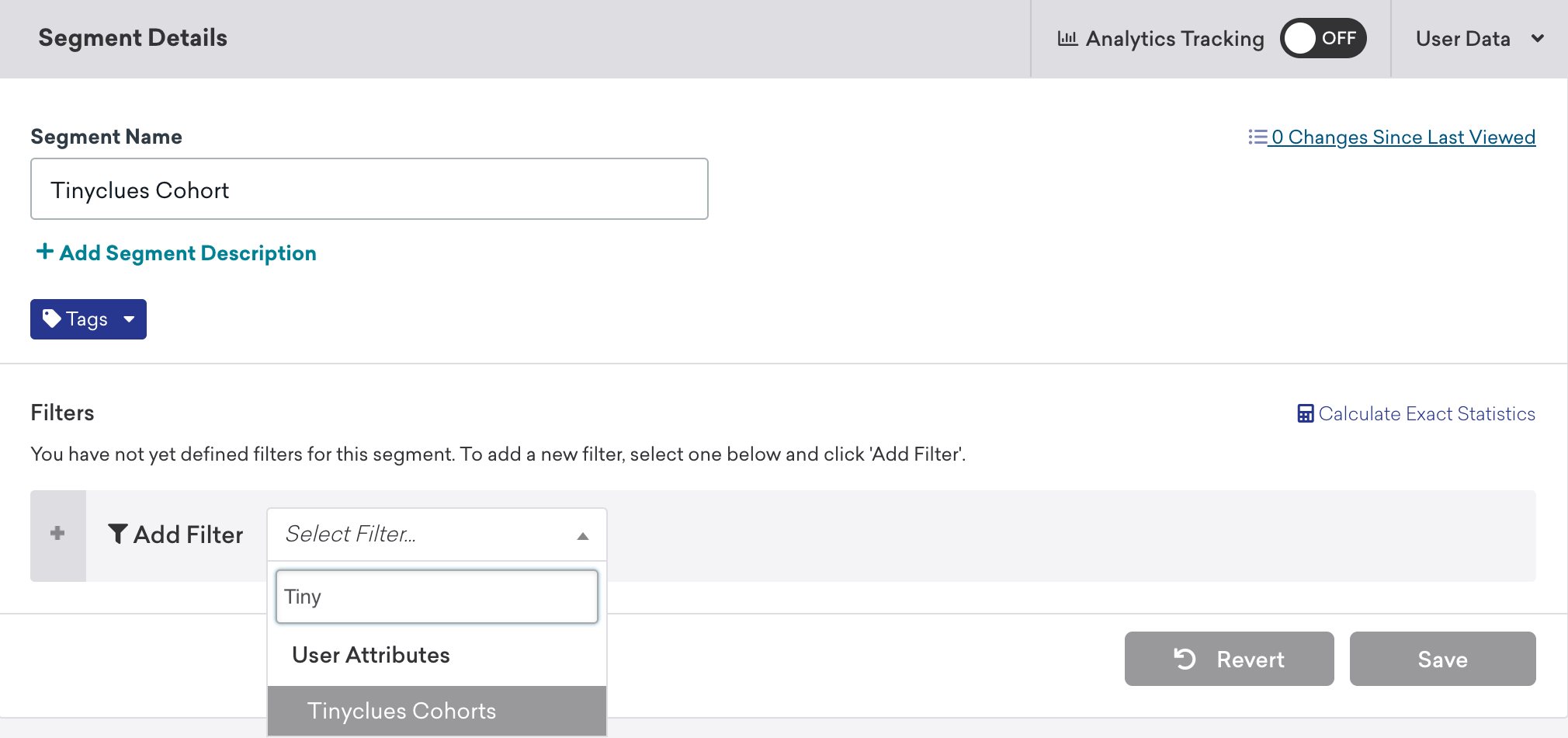 Brazeで「セグメント」に移動し、Tinycluesコホートセグメントに名前を付け、フィルターとしてTinycluesコホートを選択する。ここから、どのTinycluesコホートを含めるかを選択できる。Tinycluesコホートセグメントを作成した後、キャンペーンやキャンバスを作成する際に、オーディエンスフィルターとして選択することができる。