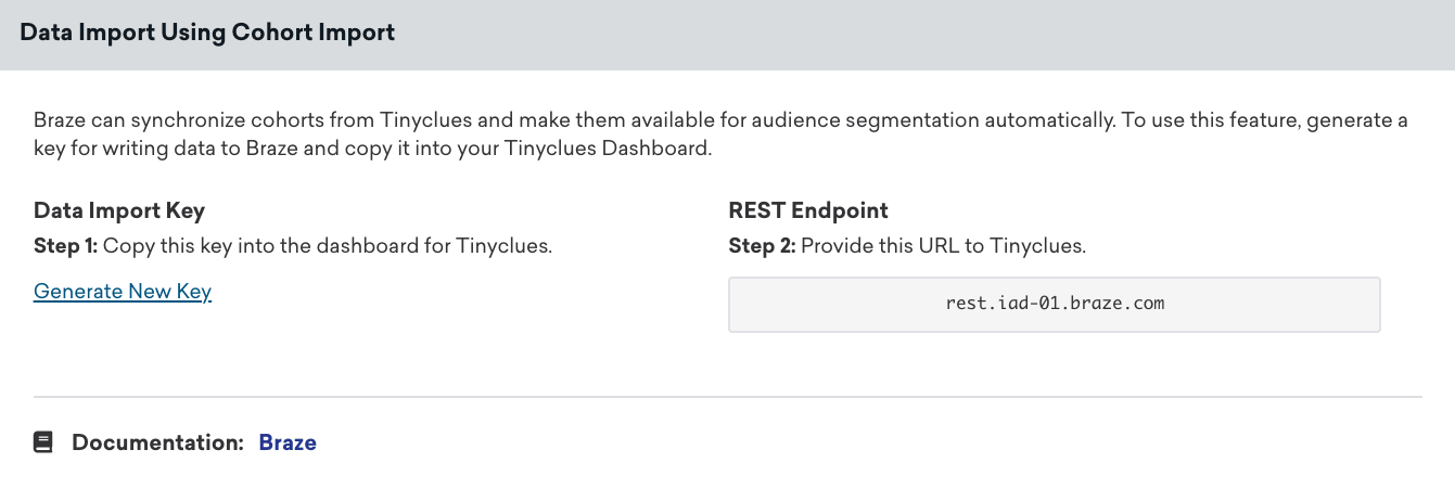 BrazeとTinycluesを統合するには、Tinycluesプラットフォームを設定し、既存のTinycluesキャンペーンをエクスポートし、今後のキャンペーンでユーザーをターゲットにするために使用できるユーザーコホートセグメントをBrazeで作成する必要がある。