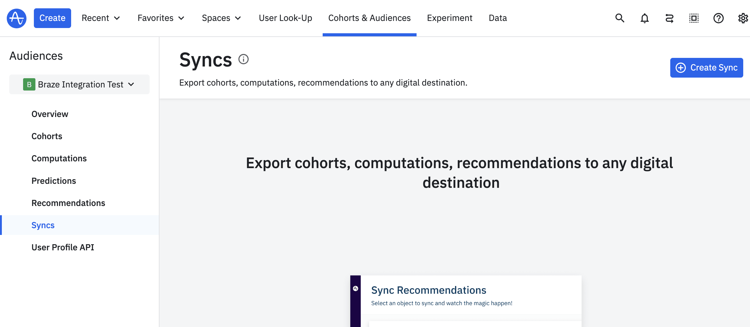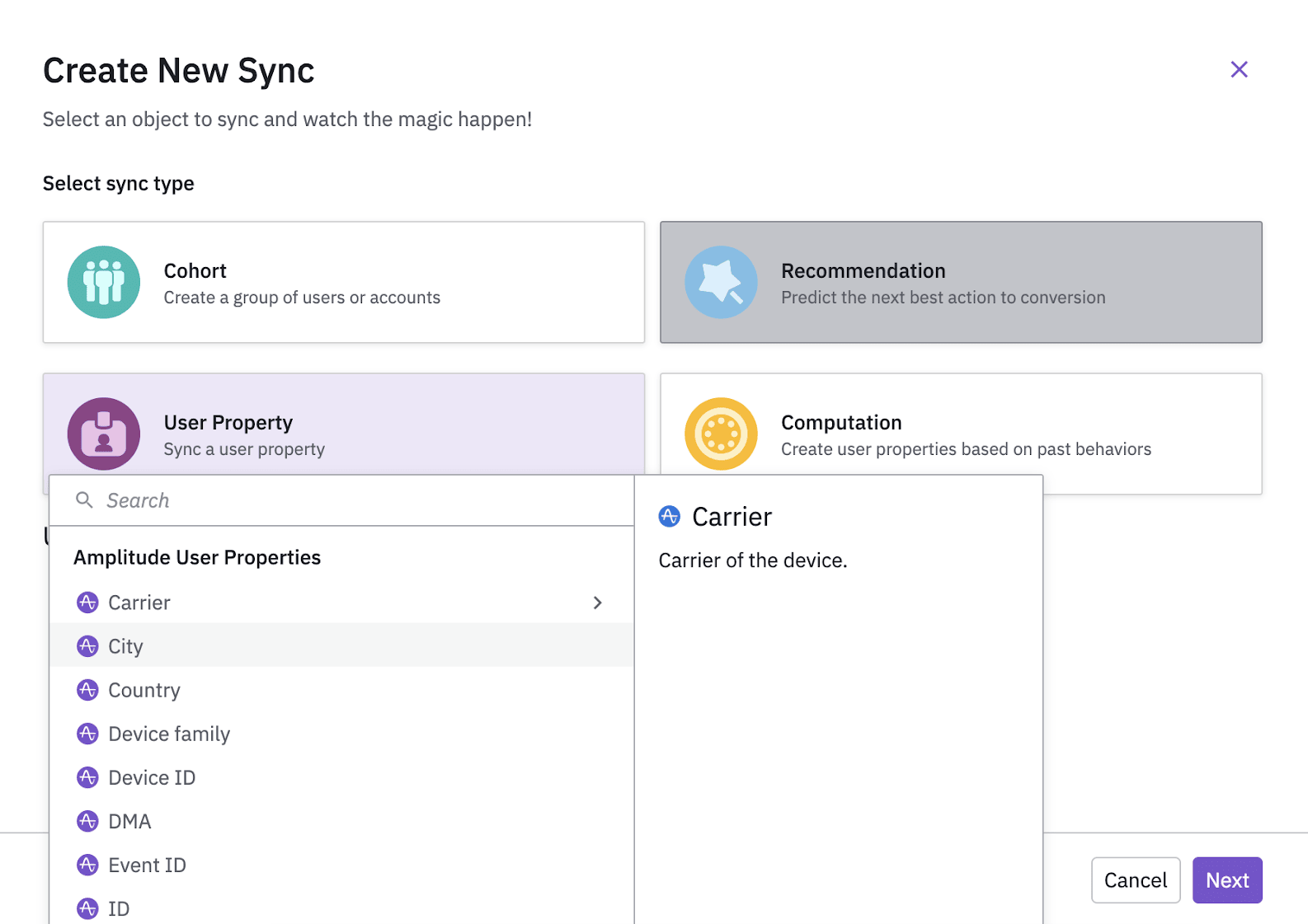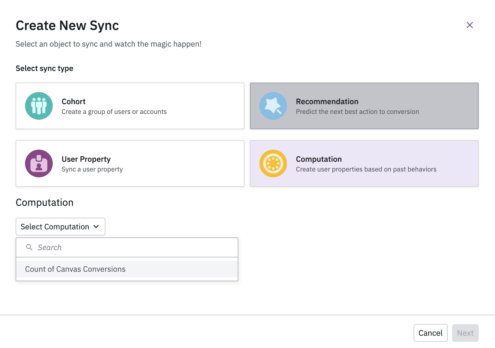 次に、ユーザーのプロパティ、計算、コホート、または推薦を同期することを選択する。