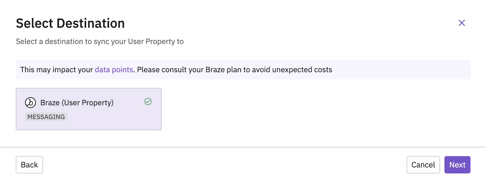 Audience を使用して、ユーザープロパティと計算をカスタム属性として Braze に送信します。過去90日間でアクティブであったユーザーのユーザープロパティまたは計算プロパティを同期できます。