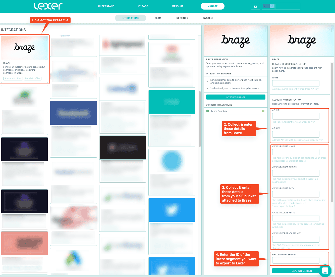 Lexerで [Manage] > [Integration] に移動し、[Braze] タイルを選択し、[Integrate Braze] をクリックします。次の情報を入力します。