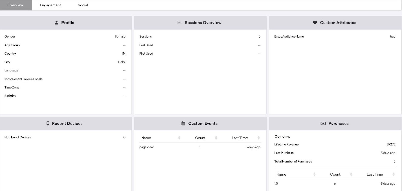 各種属性は、Braze 内のユーザーダッシュボードのさまざまなセクションに表示されます。