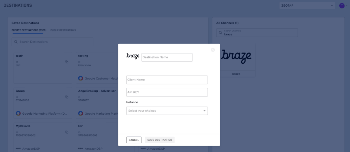 - Zeotap UnityプラットフォームからDESTINATIONSアプリケーションに移動する。