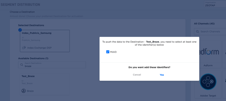 - サポートされている出力識別子を選択する:MAID、SHA256 にハッシュされたメールアドレス、または Braze で認識される1P 顧客識別子 (Braze アカウントにカスタム識別子を使用する場合は、アカウントに対して有効にできるように、Zeotap に連絡してください)。Brazeの統合に使用できる出力識別子は1つだけである。これらの識別子は、Braze SDK データを収集するときに設定された external ID と同じである必要があります。
