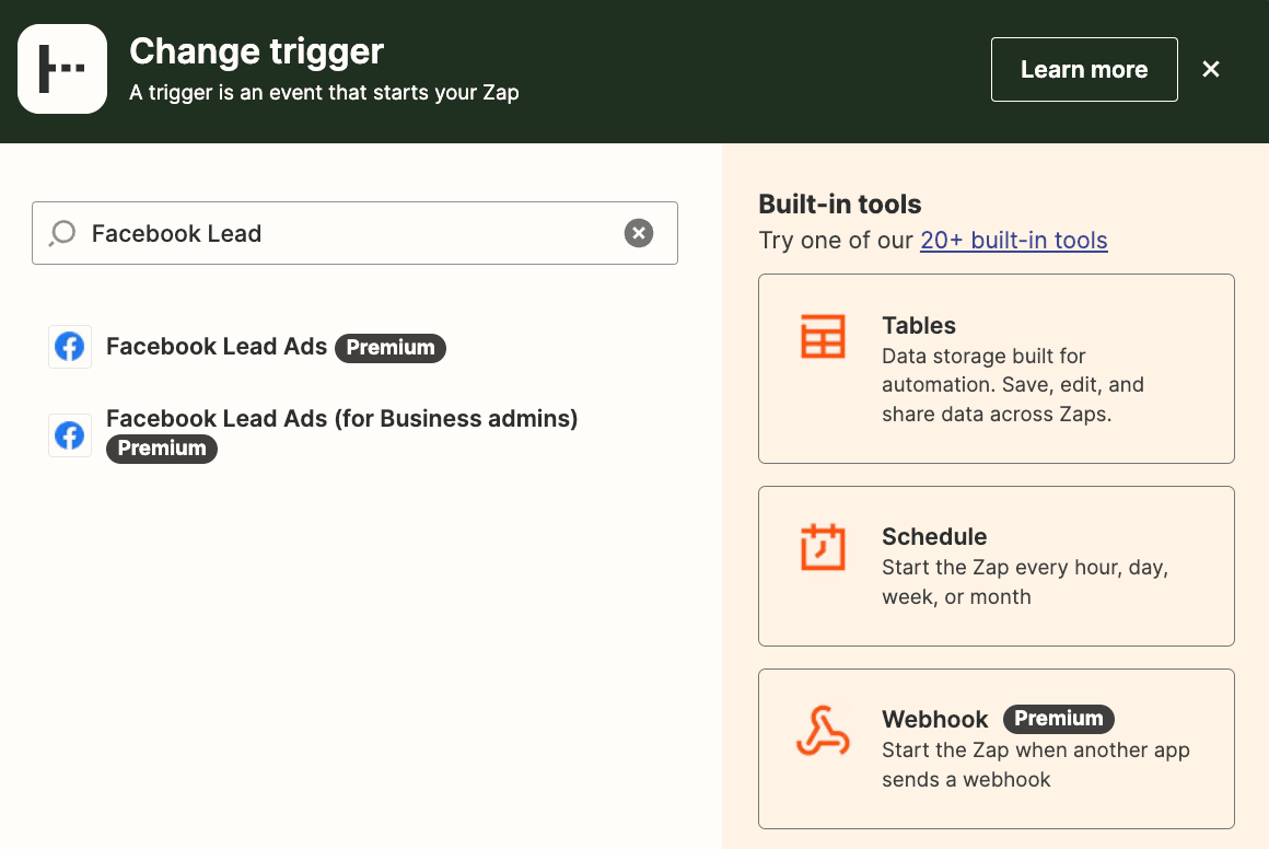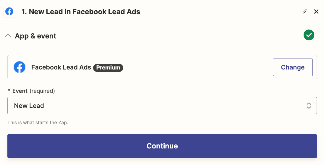 Facebook アカウントを接続したら、Zap の作成に進むことができます。トリガーの場合は、ステップ2での選択に基づいて、[Facebook Lead Ads] または [Facebook Lead Ads (for Business Admins)] を選択します。