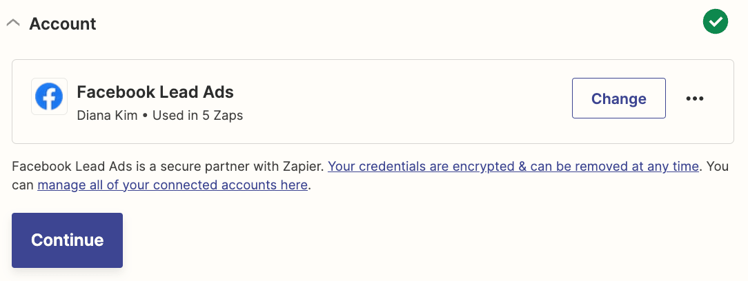 - 管理者が Facebook ページ、広告アカウント、リードアクセスにアクセスできることを確認します。次に、Zapier でアカウントを再接続します。
