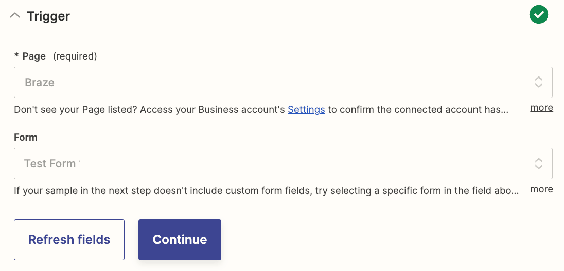 - Facebook で作成したインスタントフォームが、トリガーステップで選択したフォームにマッピングされていることを確認します。