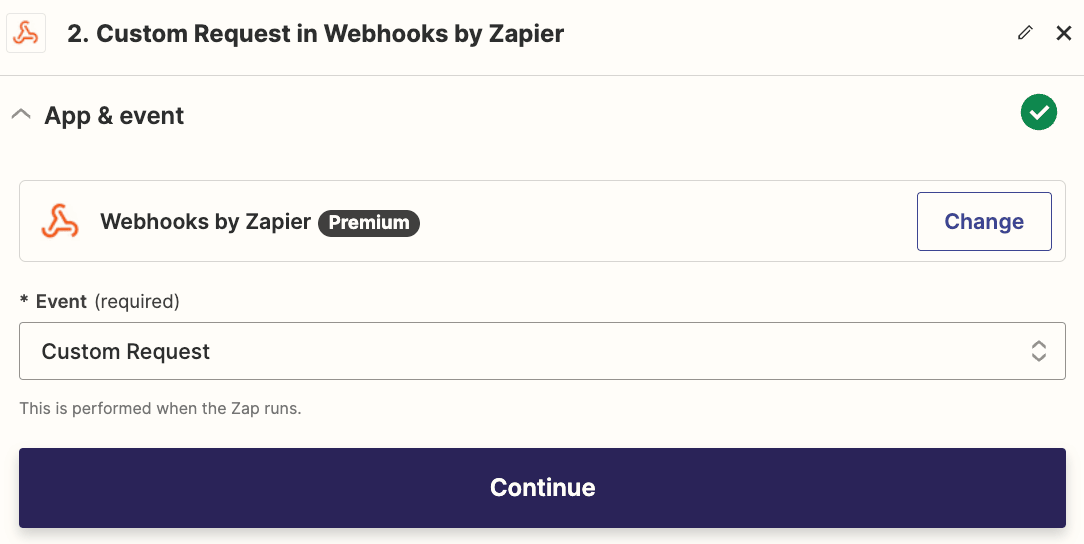 新しいステップを追加し、** Web hooks by Zapier** を選択します。次に、Custom RequestをEventフィールドに選択し、Continueを押します。