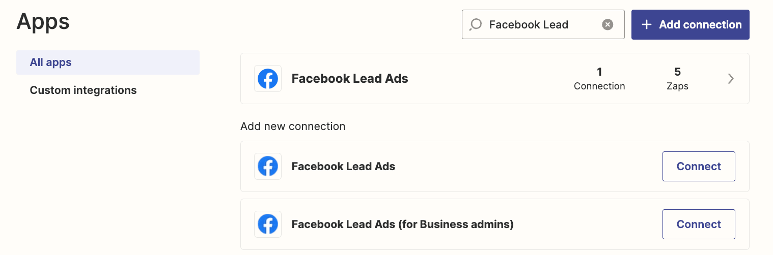 Zapier で [Apps] に移動して利用可能なFacebook アプリを検索します。[Facebook Lead Ads] または [Facebook Lead Ads (for Business admins)] のいずれかを選択します。