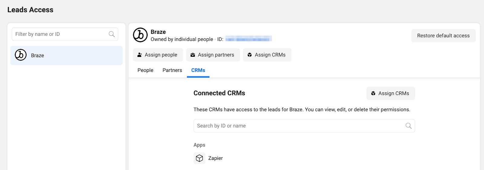 Facebook Business Manager で、左側のメニューの [Integrations] > [Leads Access] に移動します。Facebook ページを選択し、[CRMs] をクリックします。[CRM] タブで、[Assign CRMs] を選択し、[Zapier] を追加します。