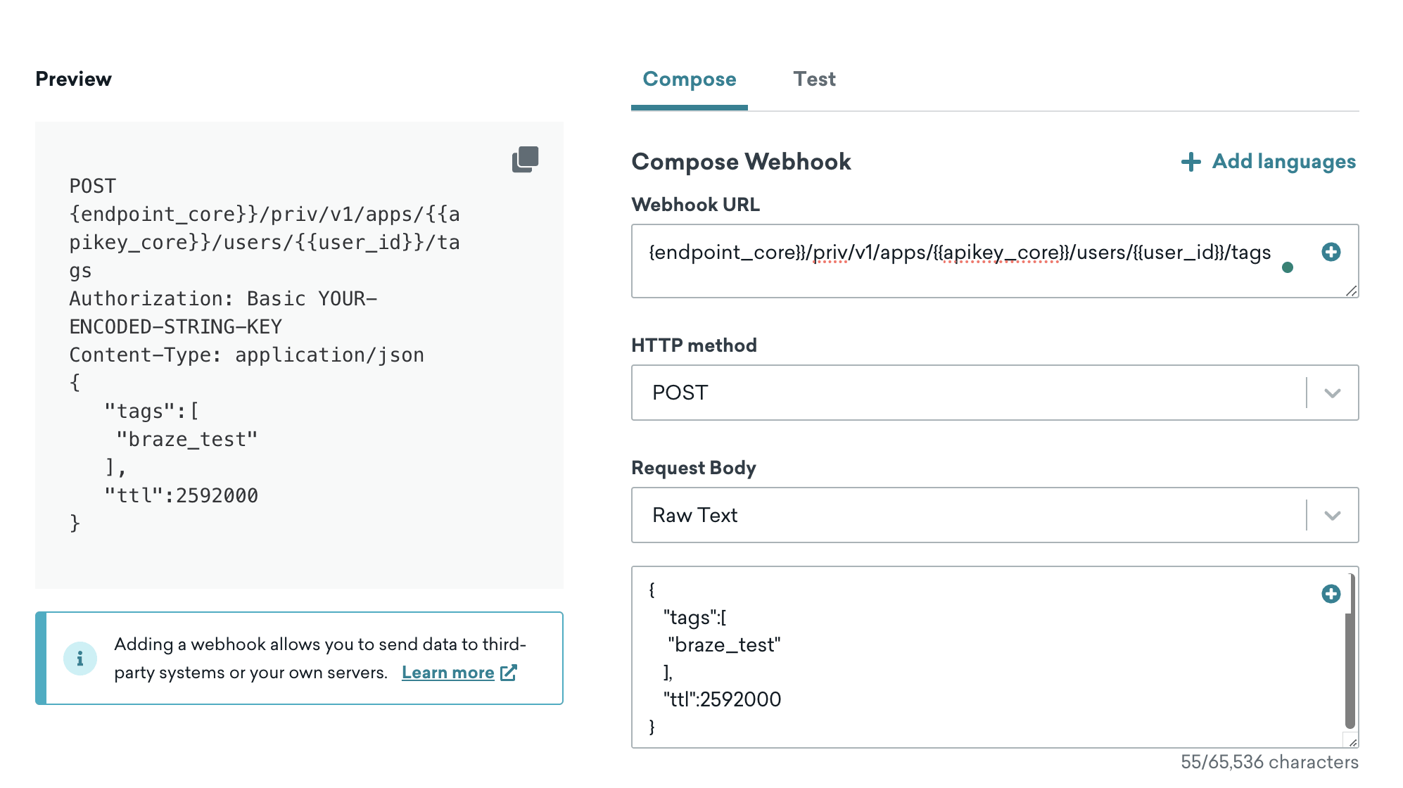 まず、BrazeでWebhookキャンペーンを作成し、Webhook URLを{{endpoint_core}}/priv/v1/apps/{{appkey_core}}/users/{{${user_id}}}/tags に設定する。Liquid を使って、URL 内でuser_id を定義します。