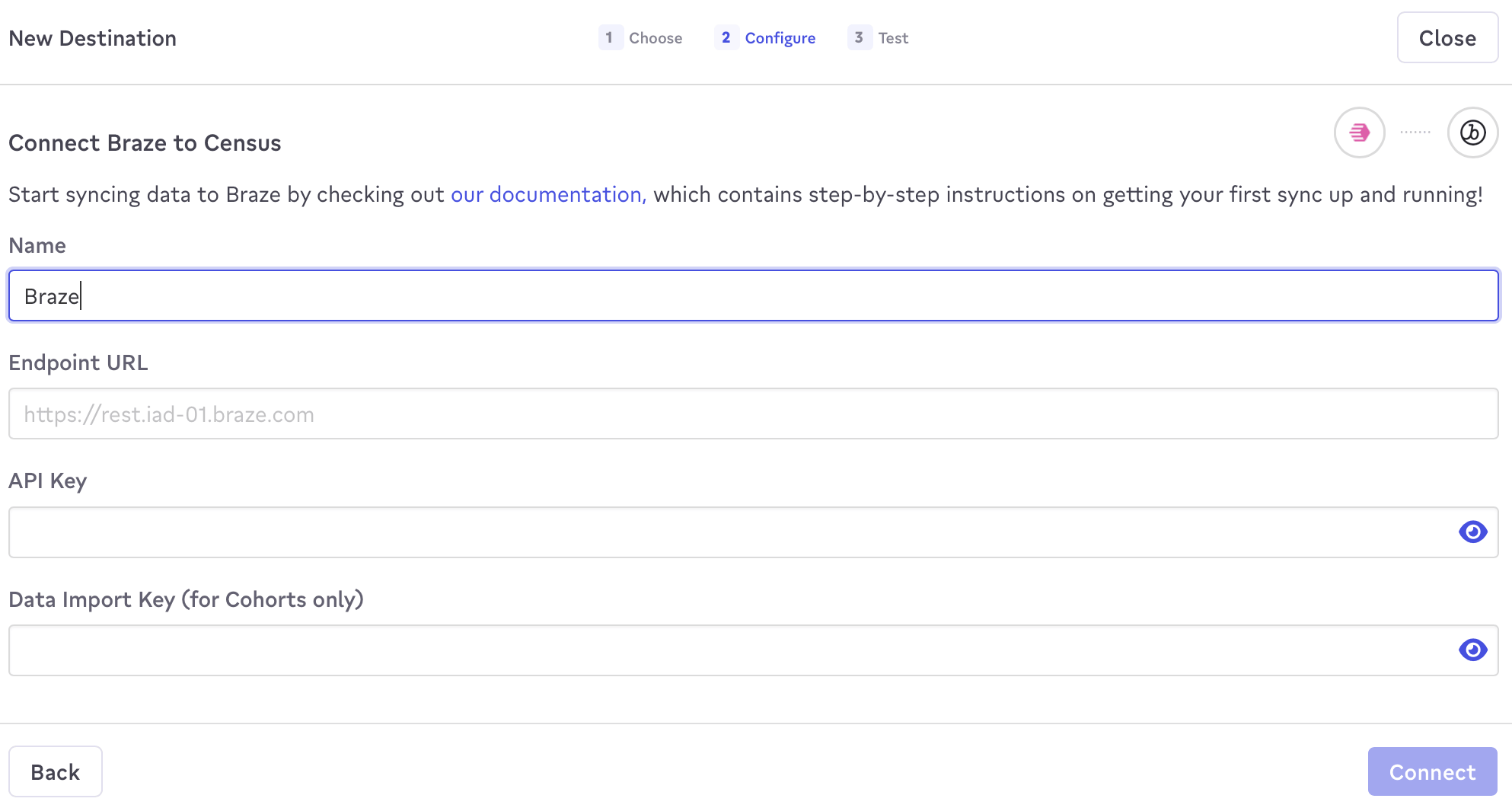 表示されるプロンプトで、この接続に名前を付け、BrazeエンドポイントURL、Braze REST APIキー、およびデータインポートキーを提供します。データインポートキーはコホートを同期するために必要であり、パートナー統合 > テクノロジーパートナー > Censusに移動することでBrazeで見つけることができます。