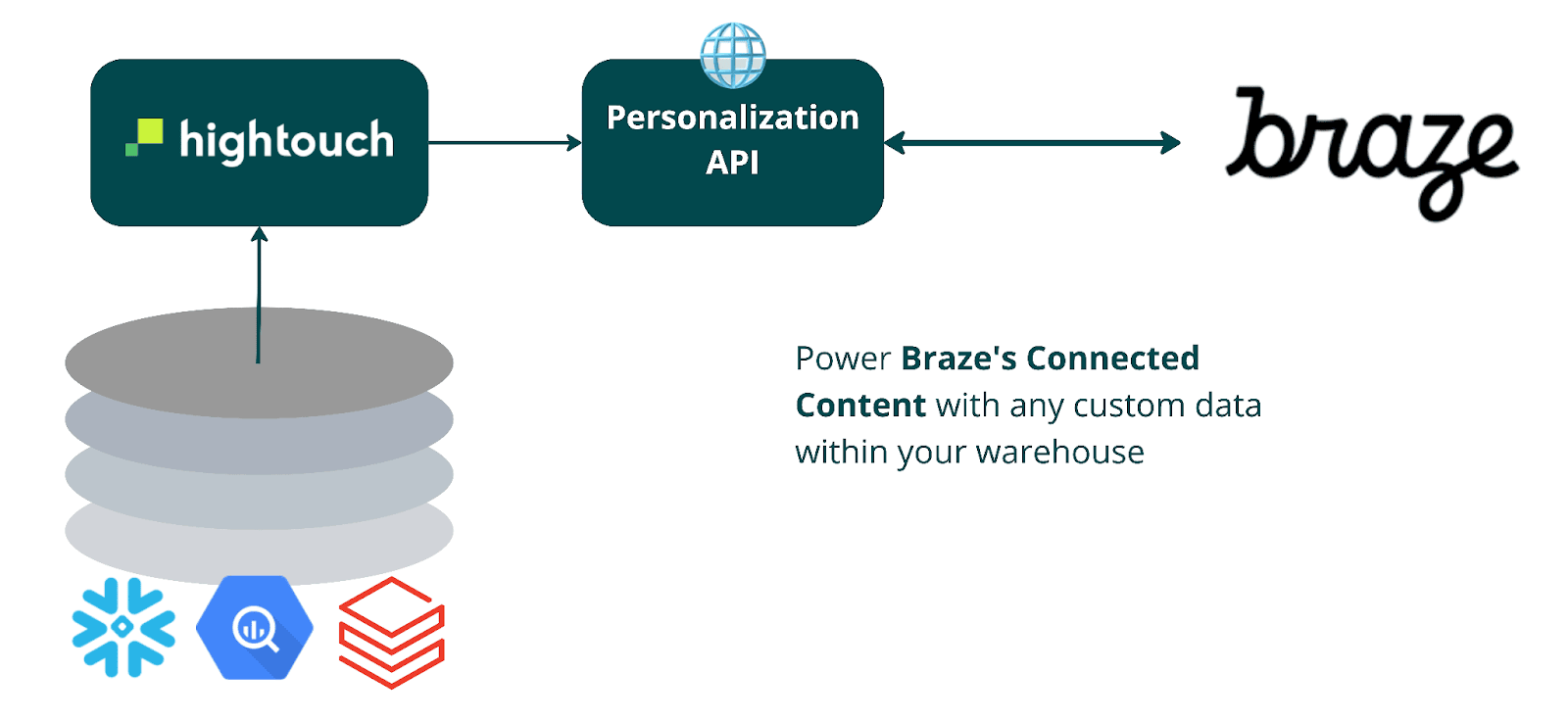 Braze と Hightouch の統合により、Braze コネクテッドコンテンツとこの API を使用して、送信時に最新の顧客またはオブジェクトのデータをキャンペーンまたはキャンバスに取り込むことができます。