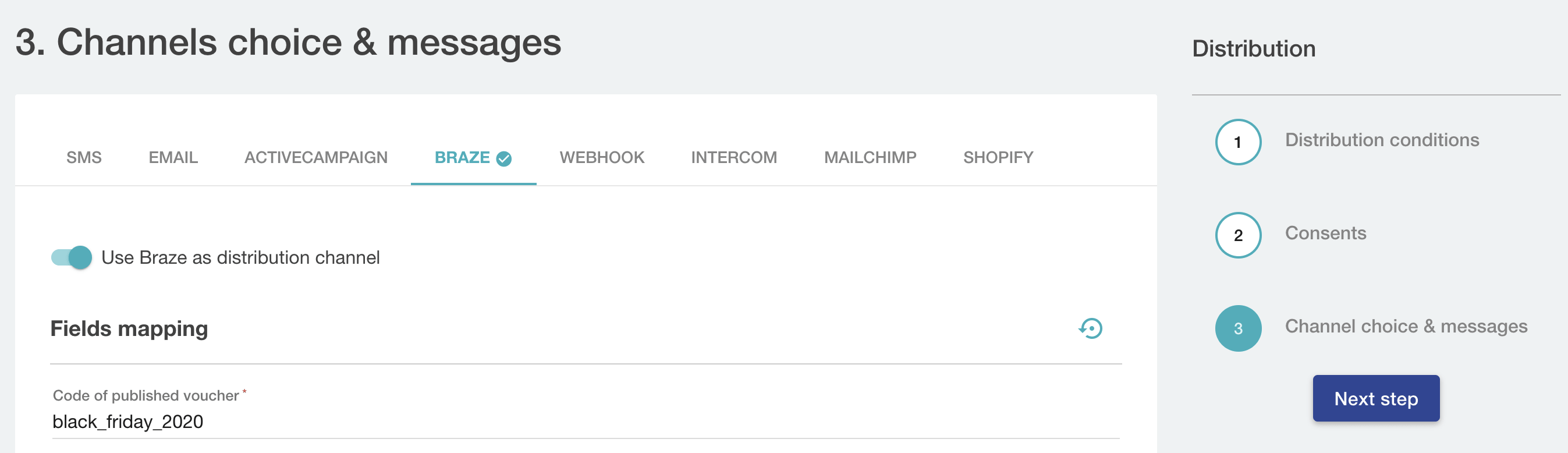 接続されると、Brazeのユーザープロファイルのカスタム属性にコードを割り当てる新しいVoucherify 配布を開始できます。後で、受け取った属性をコードと一緒にBrazeキャンペーンで使用できます。