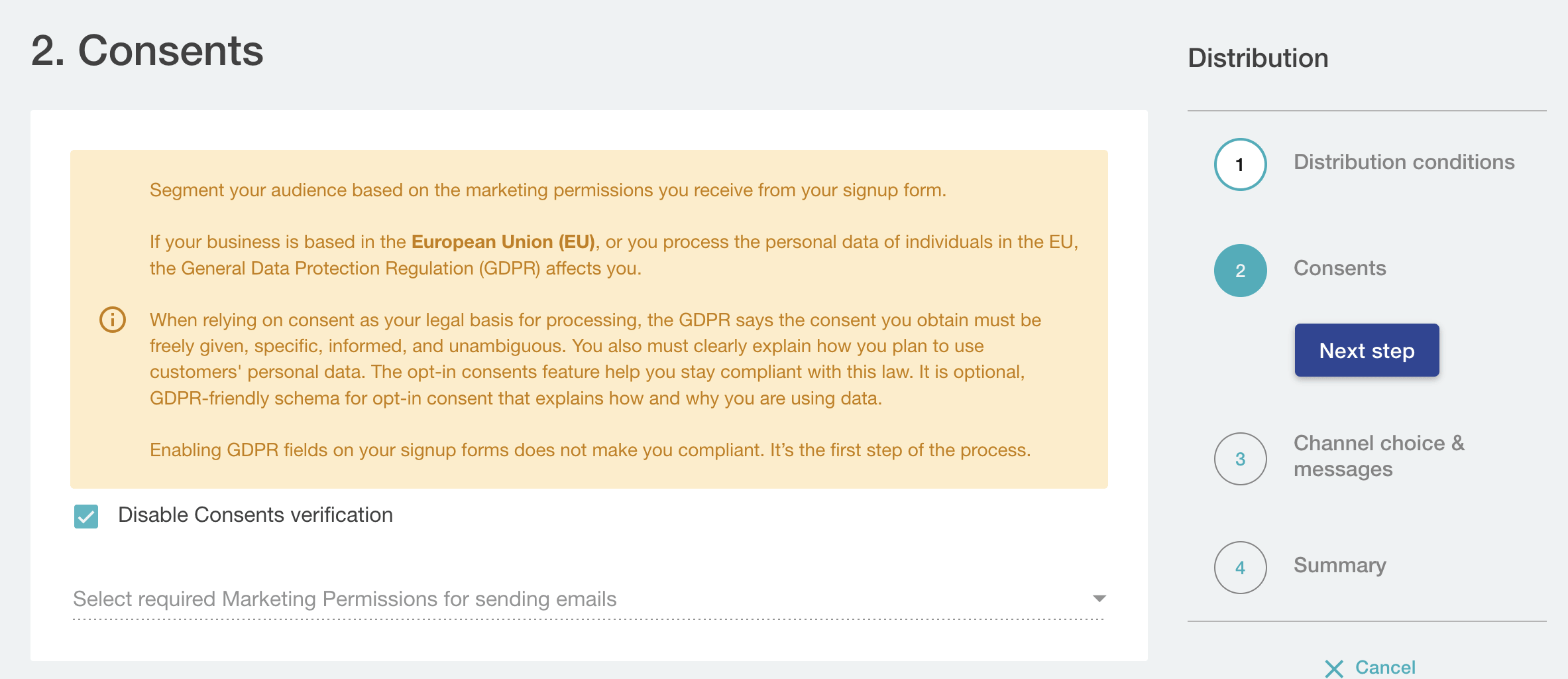 次に、マーケティングの権限を追加します。オーディエンスからの許可を収集しない場合は、同意確認を無効にしてください。