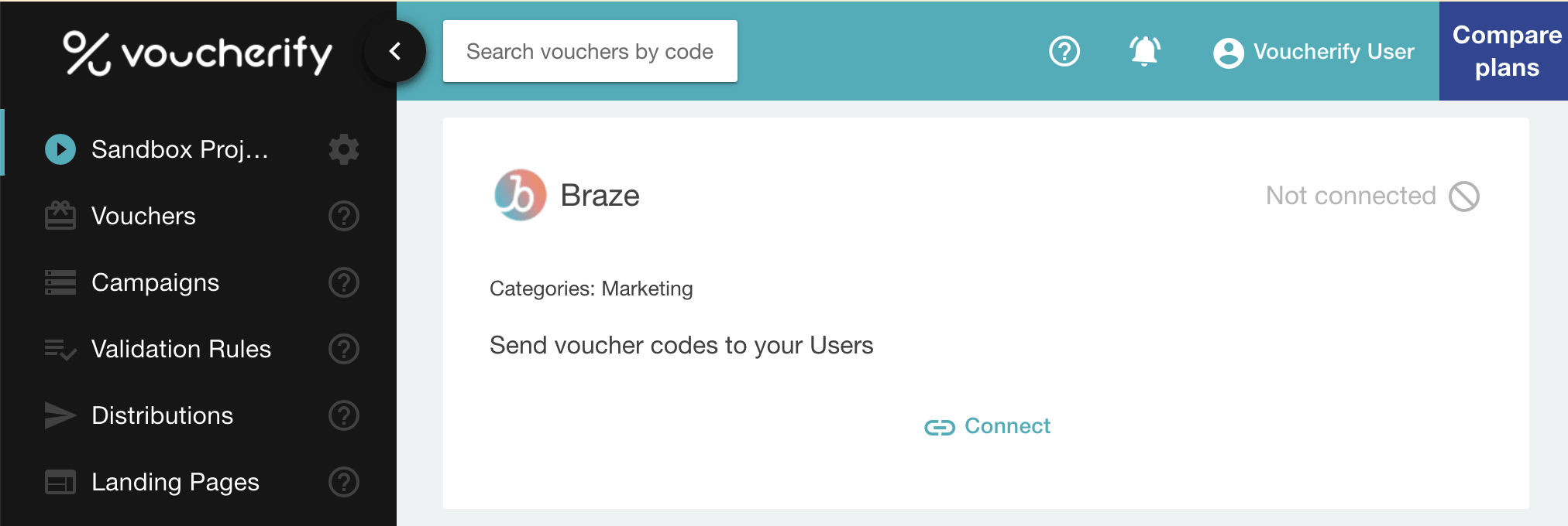 VoucherifyダッシュボードのIntegrationsディレクトリに移動し、Brazeを見つけてConnect.を選択します。