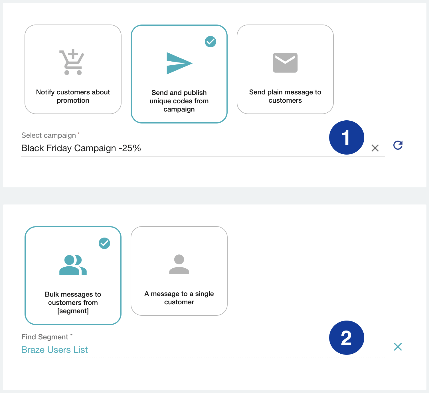 ユニークなコードのソースとなるキャンペーン(1)を選択し、ユーザーのセグメントまたは単一の顧客を受信者として選択します(2)。顧客セグメントの詳細については、Voucherify にアクセスしてください。