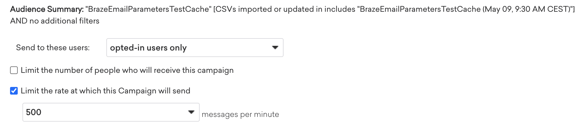 Braze によって送信されるメッセージの数を1分あたり制限するようにしてください。これにより、キャンペーンからの過剰なトラフィックに対して、BrazeおよびVoucherifyのAPIの両方が保護されます。キャンペーンの設定中にユーザーをターゲットにする場合、送信率を1分あたり500メッセージに制限してください。