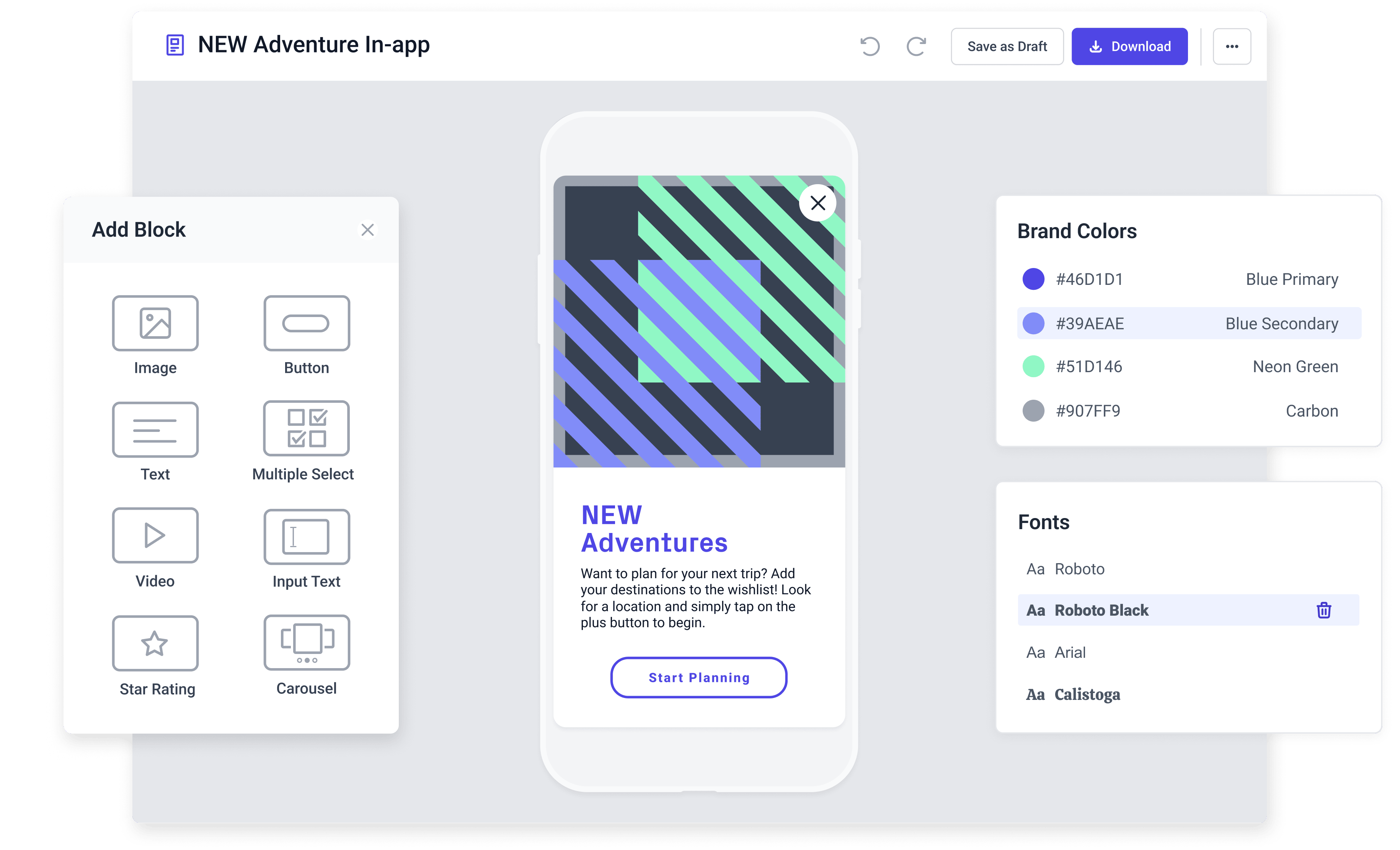 アプリ内メッセージをデザインするには、アプリ内メッセージを1つ選択します。次に、メッセージをスタイリングし、必要なコンポーネントを追加する。各コンポーネントを調整できます。