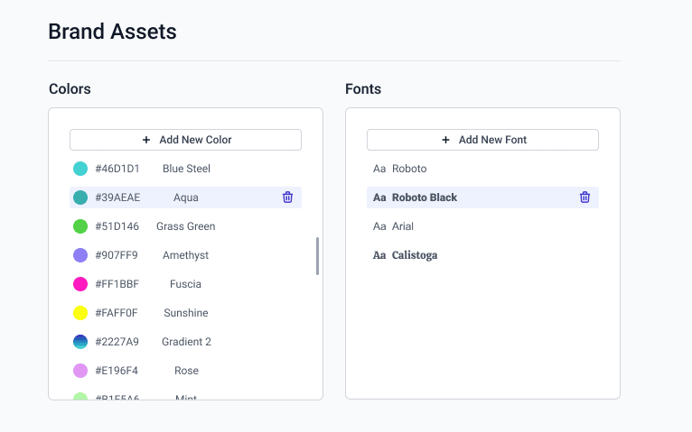B.Layer で、ページ上部のハンバーガーメニューから、[Brand assets] > [add your brand assets] をクリックします。ここで、ブランドカラーとフォントを割り当てることができる。 これで準備万端だ。これでアプリ内メッセージのデザインを開始できます。