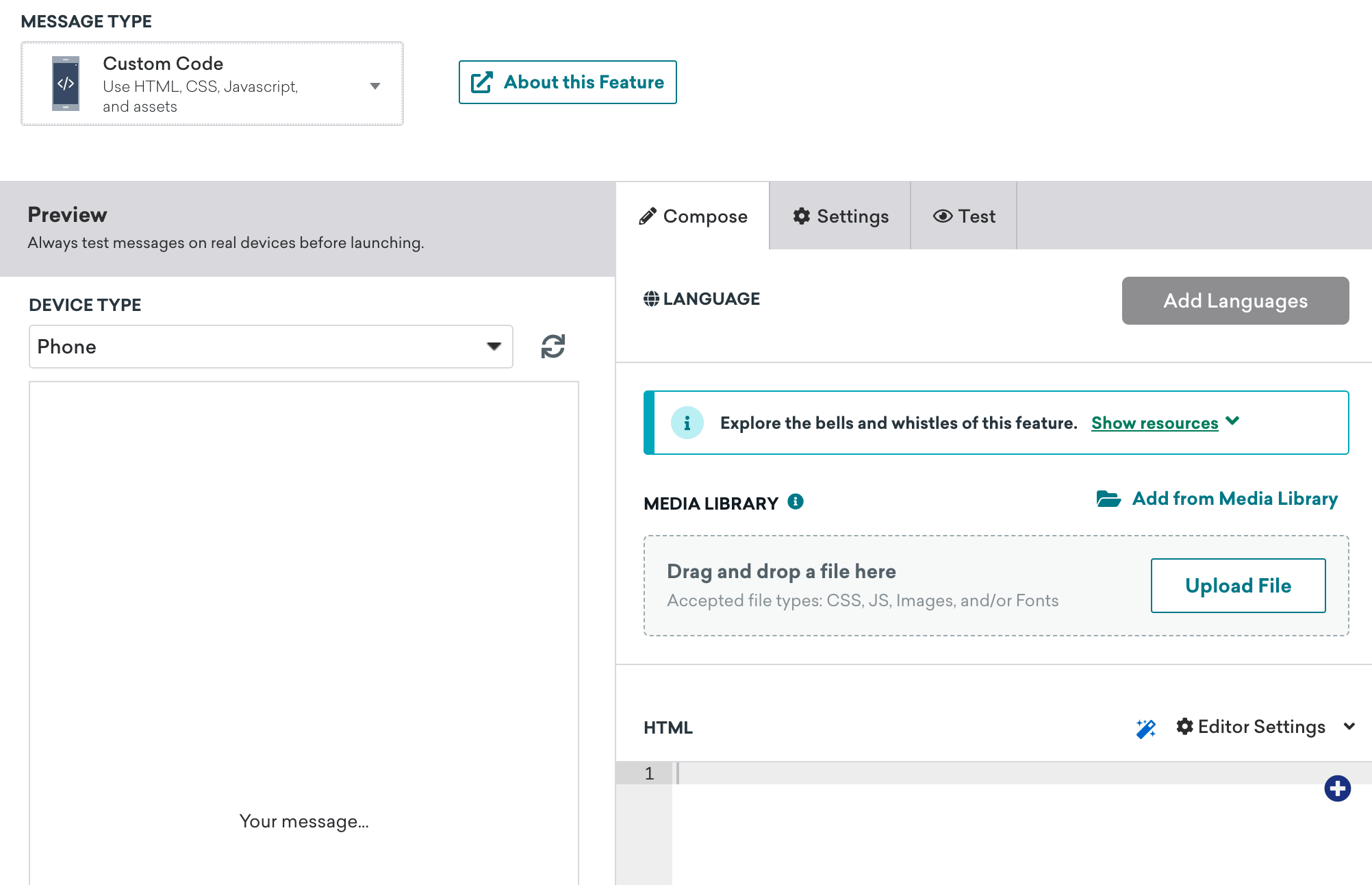 Brazeで、カスタムコードのアプリ内メッセージを作成する。ZIPファイルをお持ちの場合は、コードセクションの上のボックスにドラッグ&ドロップする。インラインHTMLファイルがある場合は、インラインHTMLをHTMLセクションに貼り付ける。
