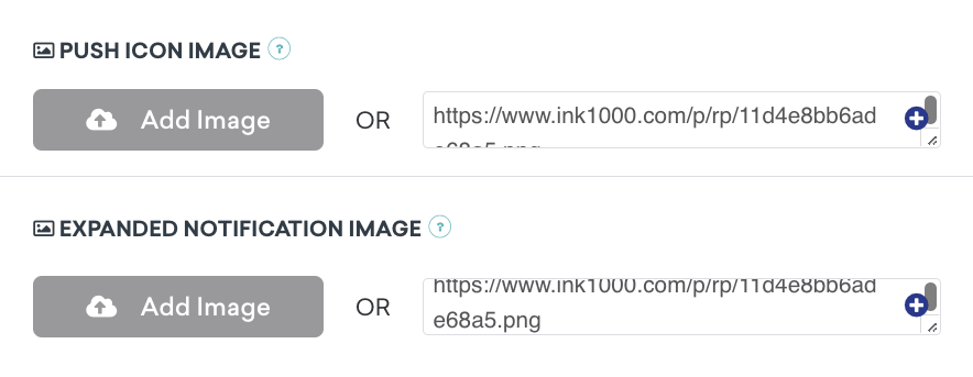 - Android プッシュ:プッシュアイコン画像と拡張通知画像フィールドにURLを貼り付けます。
