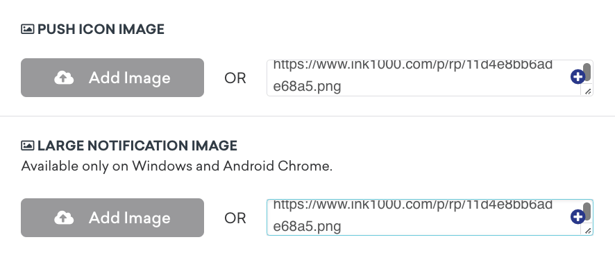 - Web プッシュURL を [プッシュ通知アイコンの画像] と [大きな通知画像] フィールドに貼り付けます。