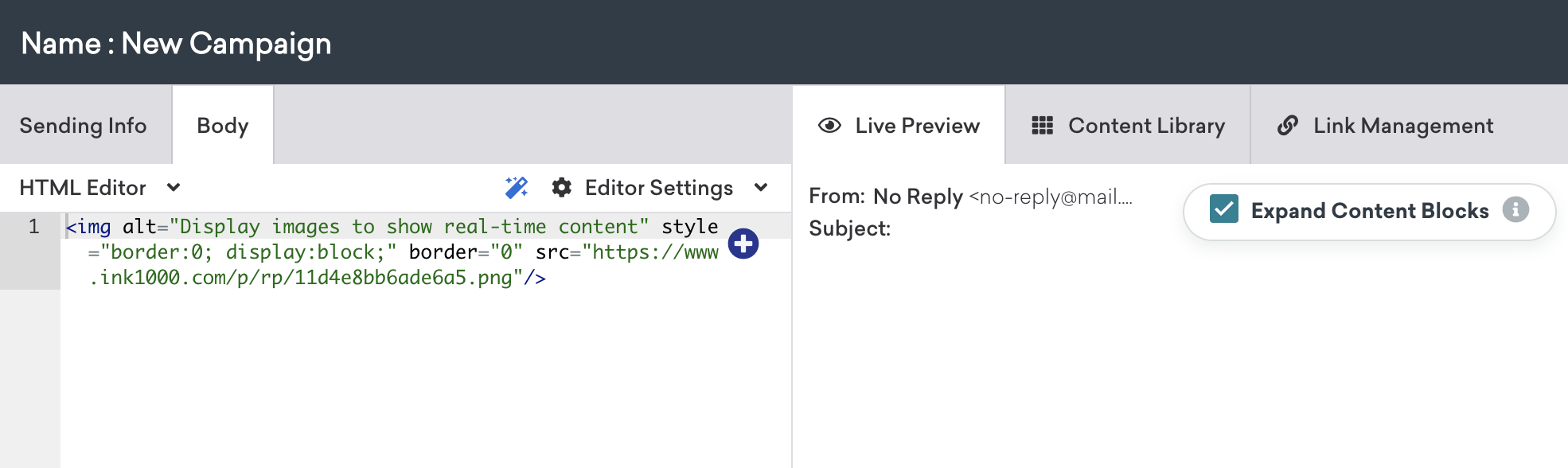 Braze プラットフォームで、クリエイティブなタグをメール本文に貼り付けます。
