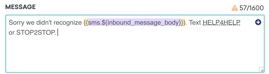 Sorry, we didn't recognize {{sms.${inbound_message_body}}}. Text HELP for help or STOP to stop.